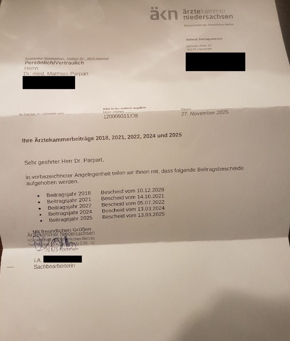 Die Ärztekammer war und ist gegenüber dem Landesrechnungshof wie stets um Ausreden und Ausflüchte nicht verlegen. bffk-Mitglied Matthias Parpart aber hatte die Ärztekammer noch vor dem Verwaltungsgericht in Stade am Haken. Seit 2016 geht der streitbare Mediziner schon gegen die Beitragsbescheide der Ärztekammer vor. Für die Jahre 2016 und 2017 hat er diese Verfahren schon rechtskräftig gewonnen. Die Ärztekammer hätte sich nun in den Folgeverfahren rechtfertigen müssen. Das wollten und konnte die Kammer offenkundig nicht. Denn vor Gericht zählen eben keine Ausreden und Ausflüchte. Daher bekam Matthias Parpart nun Ende November 2025 die Mitteilung, dass alle von ihm angegriffenen Beitragsbescheide – auch für das Jahr 2025 – aufgehoben worden sind. Die Niederlage der Ärztekammer ist vollständig. Matthias Parpart zahlt nun seit 10 Jahren keine Beiträge mehr an die Ärztekammer in Hannover. Und dies eben nicht deswegen, weil in seinem individuellen Fall Berechnungsfehler vorliegen. Sondern nur allein deswegen, weil die Ärztekammer und ihre inkompetente Führung nicht anständig – und vor allem rechtskonform – mit dem Geld der Mitglieder umgehen. Der Erfolg vom Matthias Parpart könnte der Erfolg von jedem einzelnen Arzt und jeder einzelnen Ärztin in Niedersachsen sein.