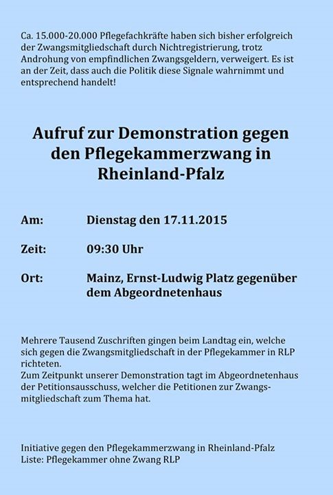 Die Demonstration gegen den Pflegekammerzwang startet am 17.11.2015 ab 9.30h vor dem Abgeordnetenhaus in Mainz.